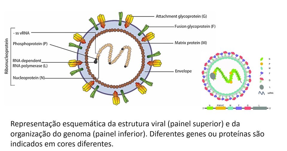 - O genoma possui seis unidades transcricionais que contêm seis proteínas estruturais. São elas: nucleocapsídeo (N), fosfoproteína (P), proteína da matriz (M), proteína de fusão (F), glicoproteína (G) e polimerase (L).
