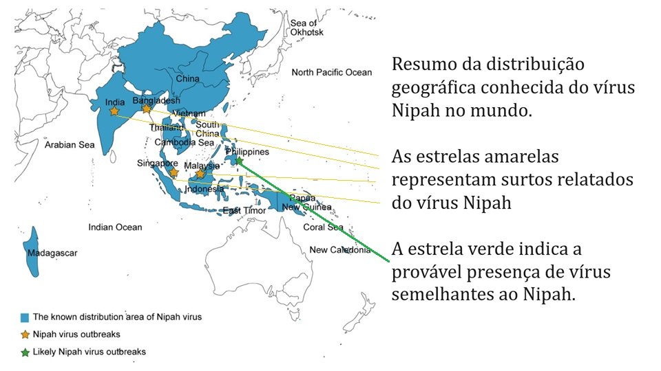 Em fevereiro de 2018, a infecção pelo vírus Nipah (NiV) foi listada como uma doença prioritária que representa um risco para a saúde pública pela Organização Mundial da Saúde ( http://www.who.int/blueprint/en/ ). O NiV recebeu esse nome em homenagem a Kampung Sungai Nipah (Vila do Rio Nipah), na Malásia, onde foi isolado pela primeira vez em 1998, antes de sua subsequente disseminação para Singapura por meio de suínos exportados em 1999, levando à infecção de trabalhadores de matadouros (CDC 1999a , b ; Paton et al. 1999 ; Epstein et al. 2006 ). Em 2001, casos humanos de infecção por NiV foram descobertos independentemente na Índia e em Bangladesh e, desde então, infecções têm sido observadas anualmente em Bangladesh, sendo comum a transmissão de pessoa para pessoa por contato direto com indivíduos infectados (Hsu et al. 2004 ; Chadha et al. 2006a , b ). Em 2007, um surto de NiV ocorreu na Índia, causando a morte de cinco pessoas (Arankalle et al. 2011 ). Em 2018, a infecção por NiV persistia em Kerala, na Índia, com 16 óbitos (Paul 2018 ). Em 2014, uma doença grave, provavelmente causada por NiV, foi relatada em várias pessoas após contato com cavalos ou pacientes infectados nas Filipinas (Ching et al. 2015 ). A infecção por NiV pode causar febre e encefalite em humanos e uma síndrome neurológica e respiratória em porcos ou cavalos (Lee et al. 1999 ; CDC 1999a , b )
